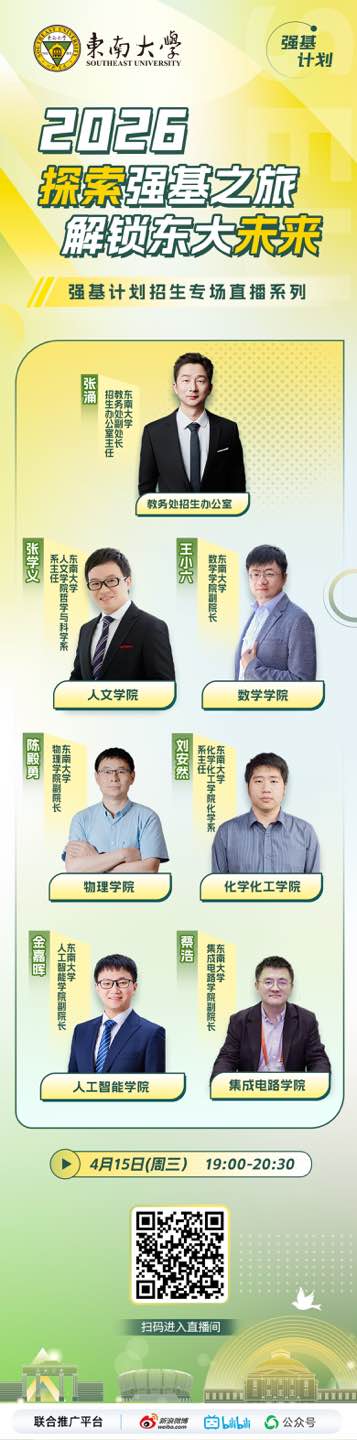 东南大学东南大学是我国最早建立的高等学府之一,秉承“止于至善”的校训,赢得了“以科学名世,以人才报国”的广泛赞誉。为全面贯彻全国教育大会精神,我校2025年继续开展基础学科招生改革试点(也称“东南大学强基计划”),探索多维度考核评价模式,选拔一批有志向、有兴趣、有天赋的青年学生进行专门培养,为国家重大战略领域输送后备人才。